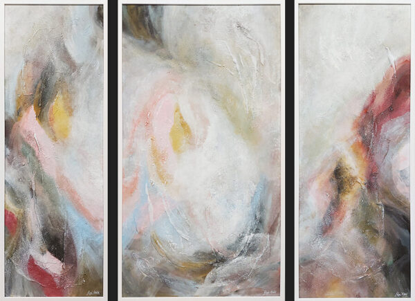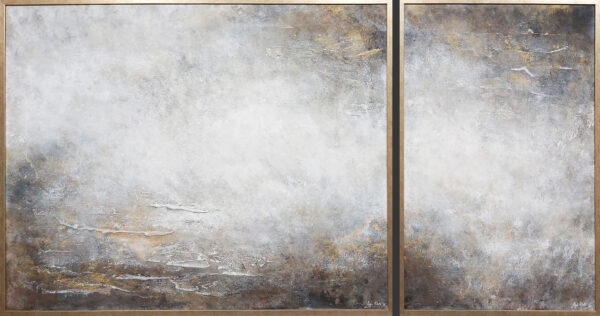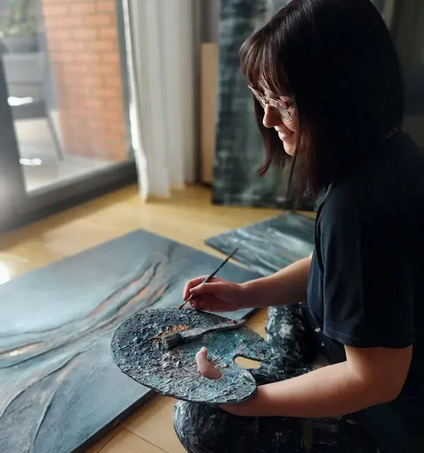 As soon as we are agreed, I order the canvas and start my creative process. First I focus on creating a rich texture. I then play with the colors, creating harmonious transitions, and with gold and silver leaves adding a sense of luxury, until I achieve the desired visual effect.