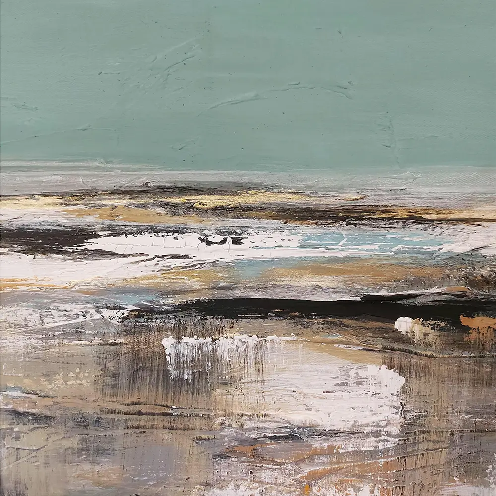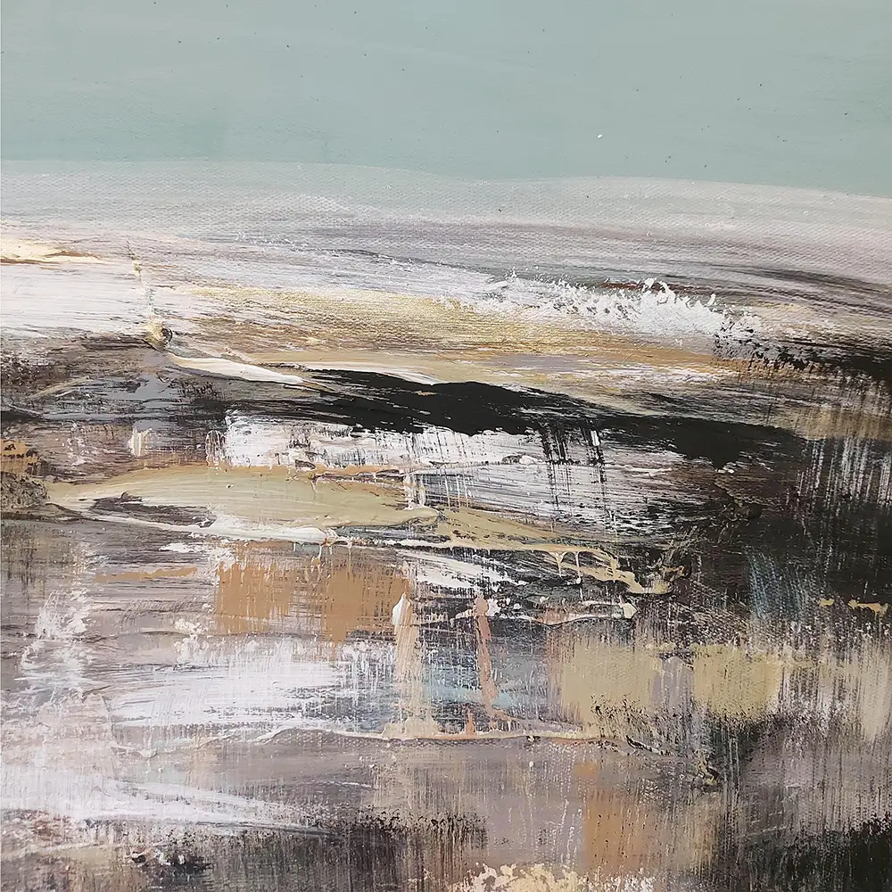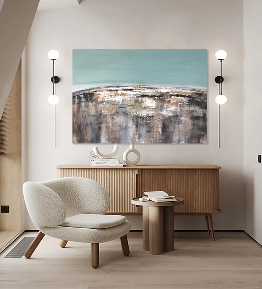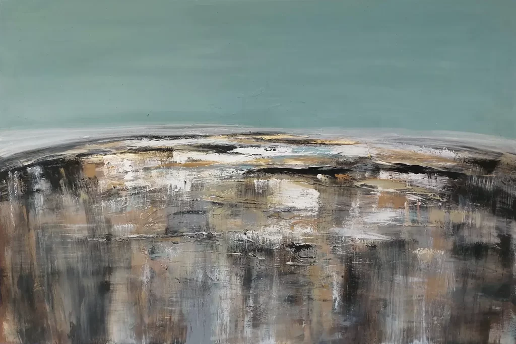 “Babylon” is an abstract painting that evokes a sense of complexity and contrast. The upper third of the canvas is bathed in a serene, solid light blue, creating a calm, open expanse. In contrast, the lower two-thirds of the painting are filled with dynamic color masses in white, black, gray, and brown, suggesting a blend of structured chaos and earthy depth. The interplay of colors and forms evokes a feeling of mystery and tension, hinting at the ancient and enigmatic nature of the mythic city of Babylon.