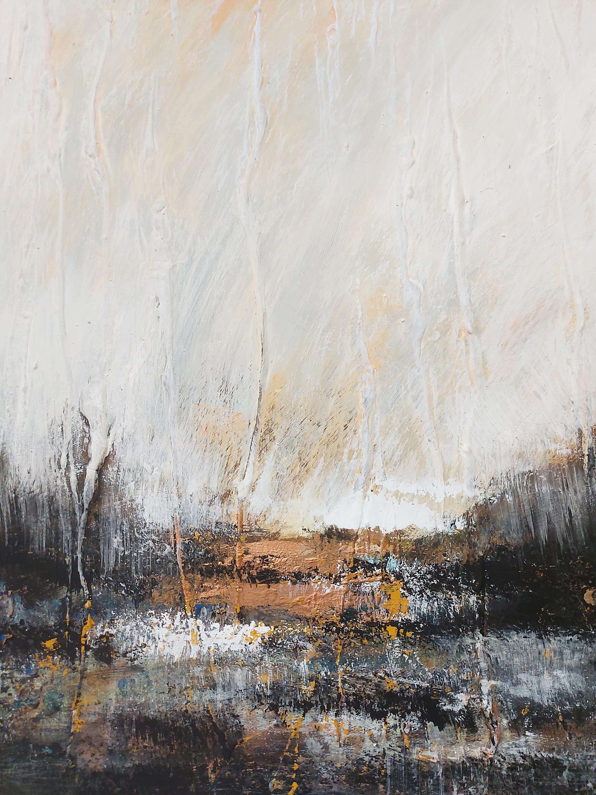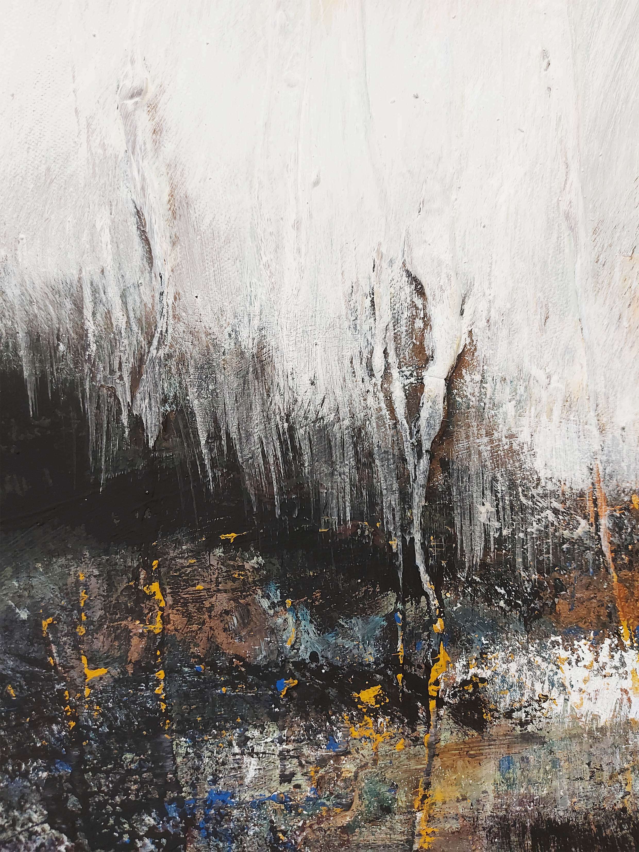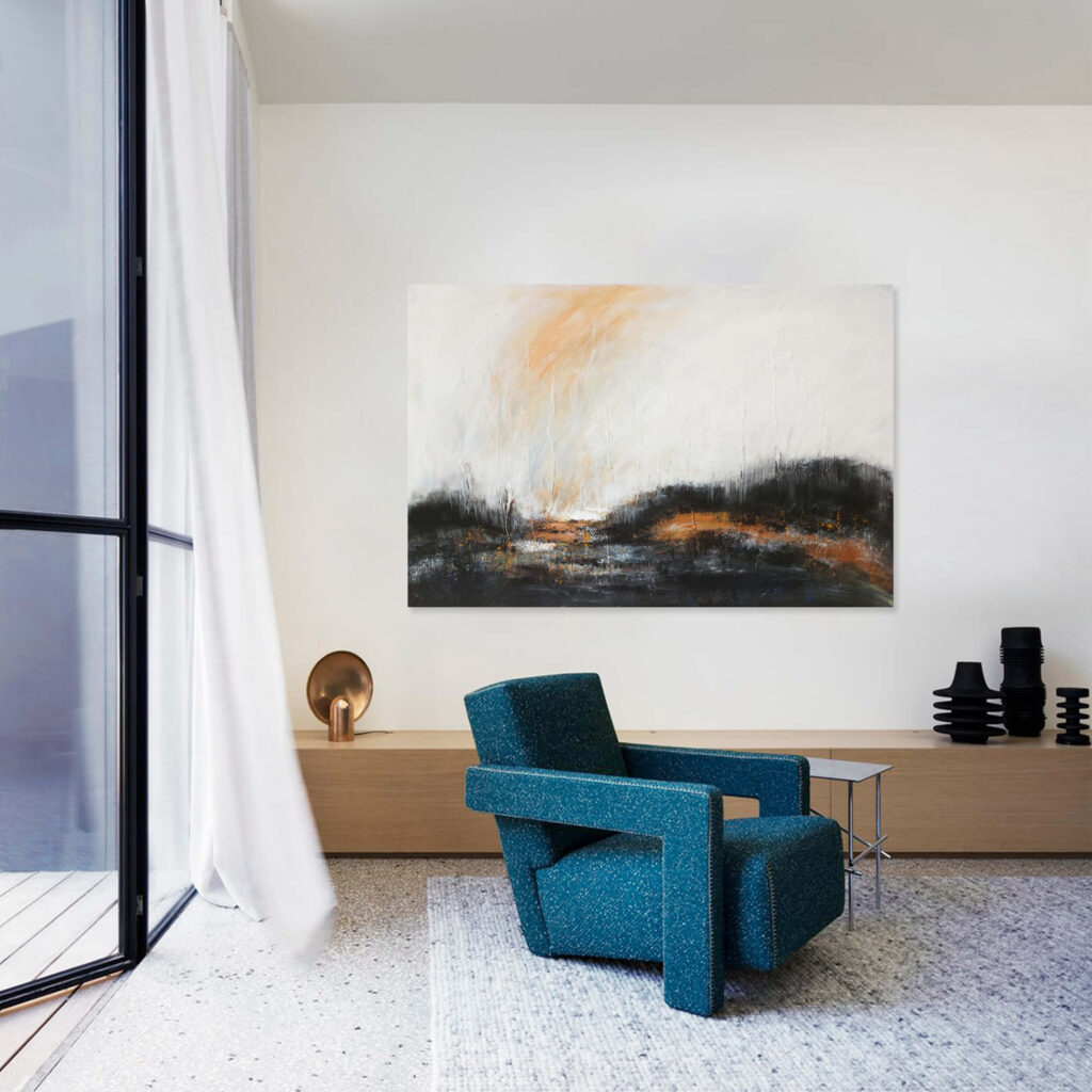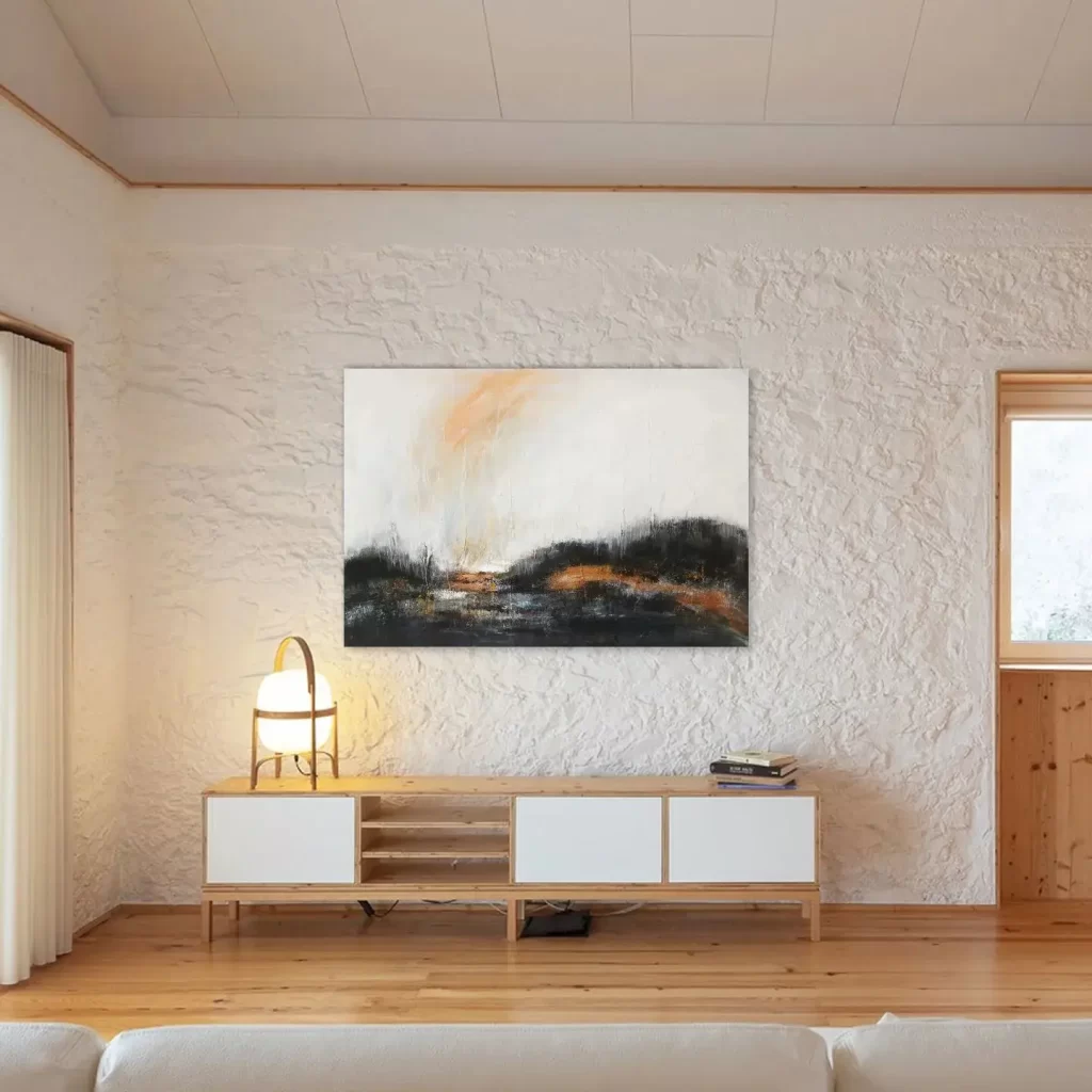 “Night on the Bald Mountain” captures the eerie, mysterious essence of a dark, untamed landscape. The composition is dominated by bold black and white contrasts, evoking a sense of nightfall and starkness. Orange accents punctuate the piece, adding a fiery, almost mystical glow that suggests hidden energy or a fleeting presence. The dramatic interplay of light and shadow, coupled with the intense color accents, creates a powerful atmosphere, inviting the viewer to immerse themselves in a haunting, surreal interpretation of Modest Mussorgsky’s haunting composition through visual abstraction.
