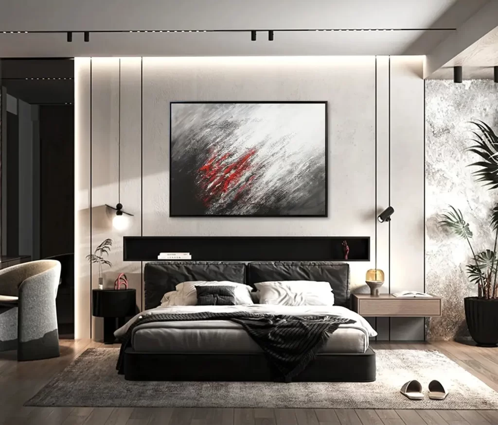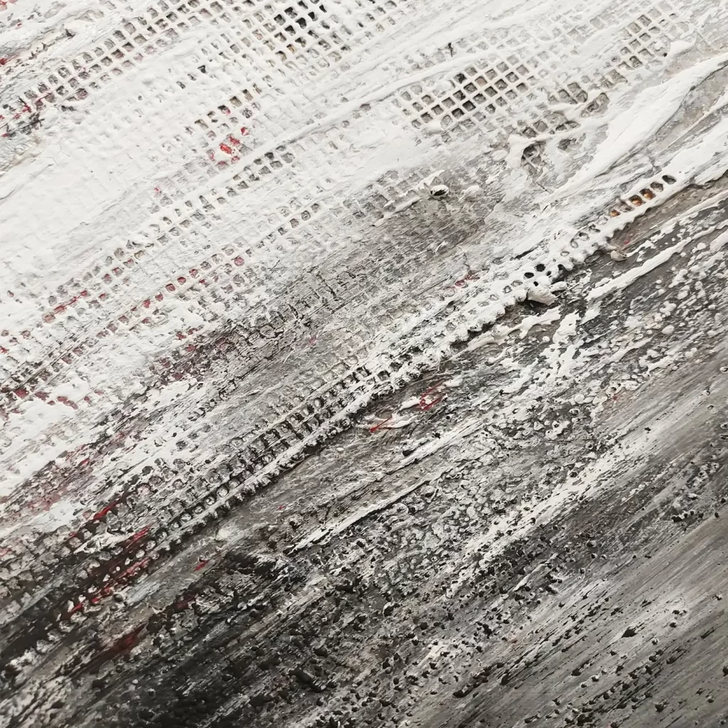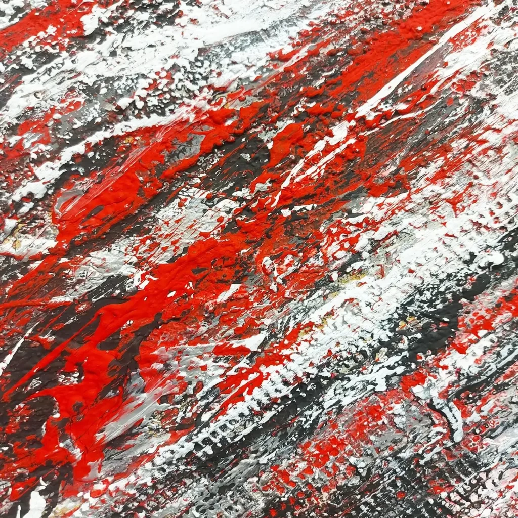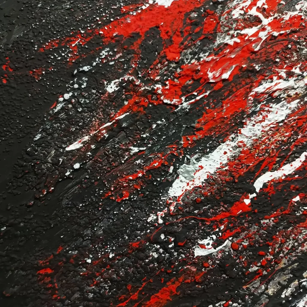 “Red Storm” is an abstract exploration of contrast and texture, where bold black and white elements collide in a dramatic composition. Turbulent interplay of these stark tones is punctuated by striking red accents at the center, symbolizing a fierce energy at the heart of the chaos. The textured surface adds a visceral quality, amplifying the raw power and intensity of the storm’s emotional force.