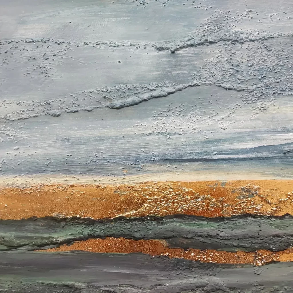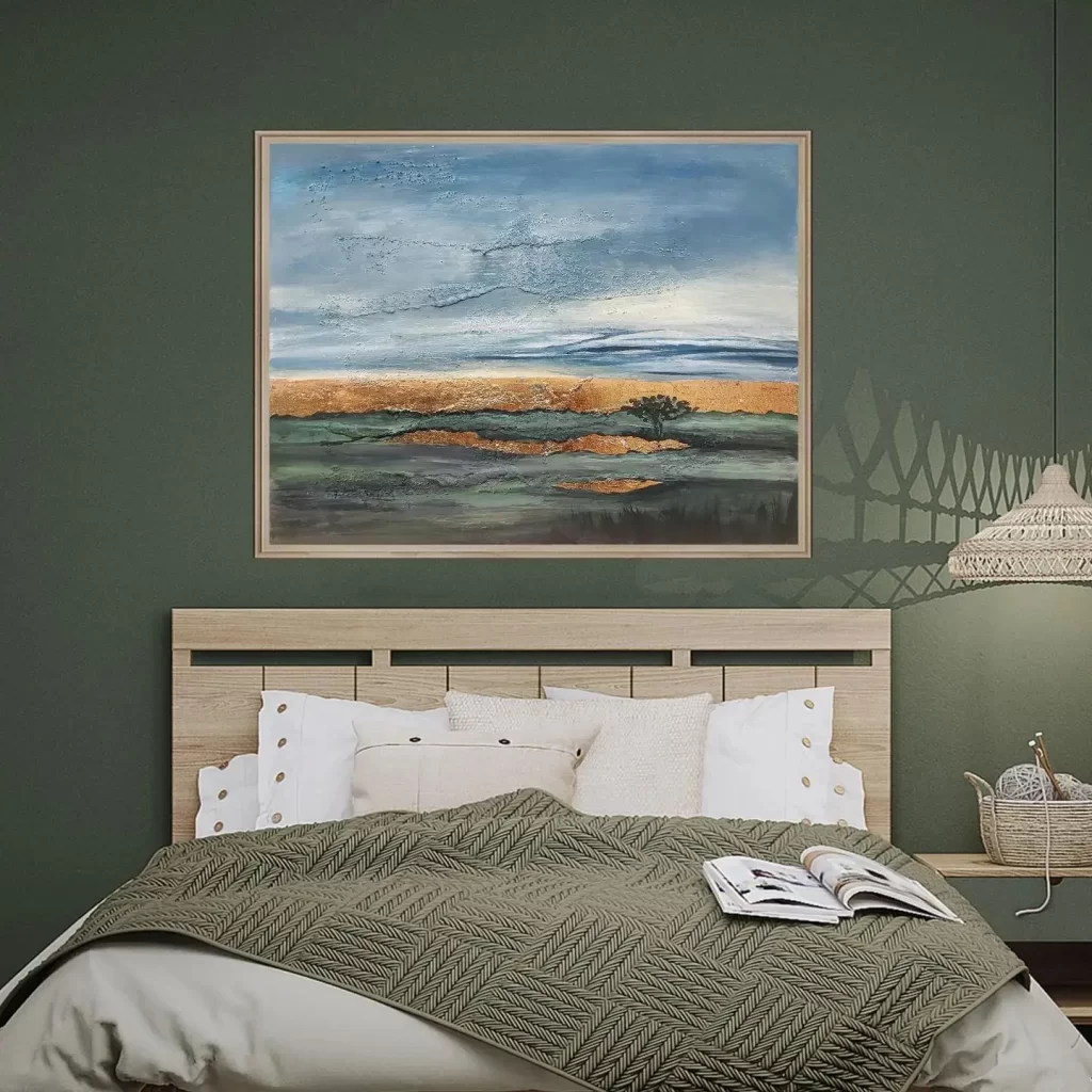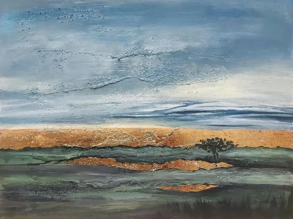 “Savanna” is an abstract landscape that evokes the serene beauty of a sun-drenched natural terrain. Hues of blue and green flow harmoniously across the canvas, reminiscent of vast skies and lush earth. Horizontal stripes of golden leaves weave through the composition, capturing the warmth and glow of sunlight filtering through a wild, expansive savanna. The painting invites a sense of tranquility and connection to nature’s timeless beauty.