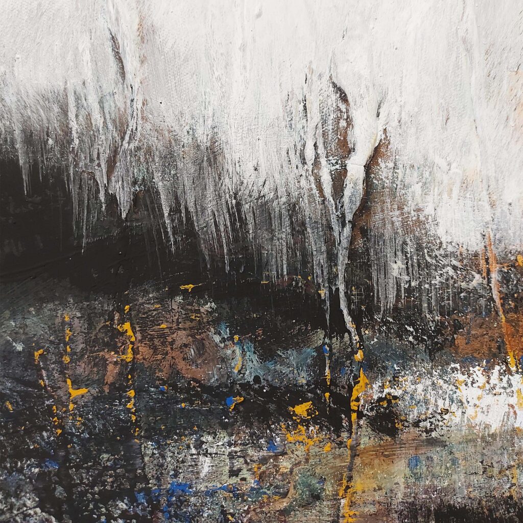 „Noć na pustoj gori“ hvata misterioznu i divlju suštinu mračnog, neukroćenog pejzaža. Kompozicijom dominiraju smeli crno-beli kontrasti, izazivajući osećaj sumraka i dinamičnosti. Narandžasti akcenti kompoziciji dodaju vatreni, gotovo mistični sjaj koji sugeriše skrivenu energiju ili prolazno prisustvo. Dramatična interakcija svetlosti i senke, zajedno sa akcentima intenzivne boje, poziva posmatrača da se uroni u nadrealnu interpretaciju čuvene muzičke kompozicije Modesta Musorgskog kroz vizuelnu apstrakciju.