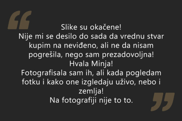 Uz svaku sliku dobijate sertifikat o autentičnosti dela. Pre isporuke, svaku sliku pažljivo upakujem u pucketavu foliju, a po potrebi i u rebrasti karton – ukoliko se šalje kurirskim službama. Sliku je moguće preuzeti i lično u Beogradu.