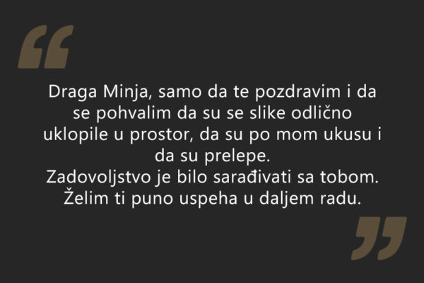 Kombinujući znanja iz oblasti arhitekture sa slikarstvom, nastojim da stvaram dela koja imaju umetničku vrednost, a istovremeno upotpunjuju arhitektonski prostor u kome se nalaze.
