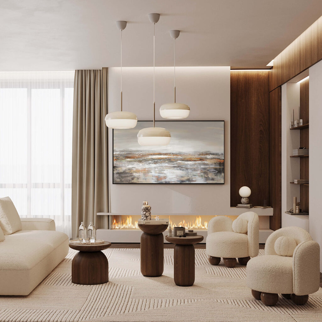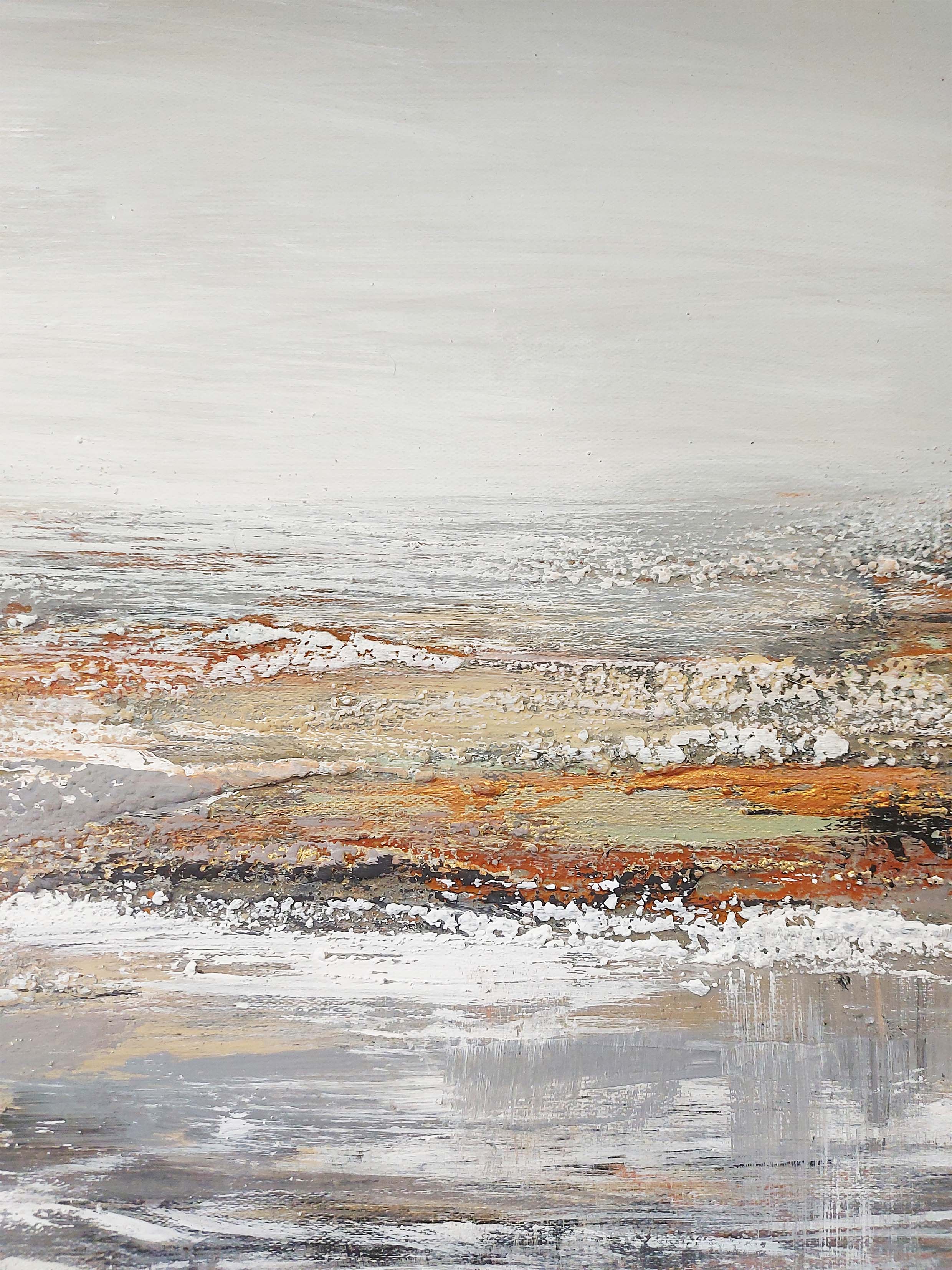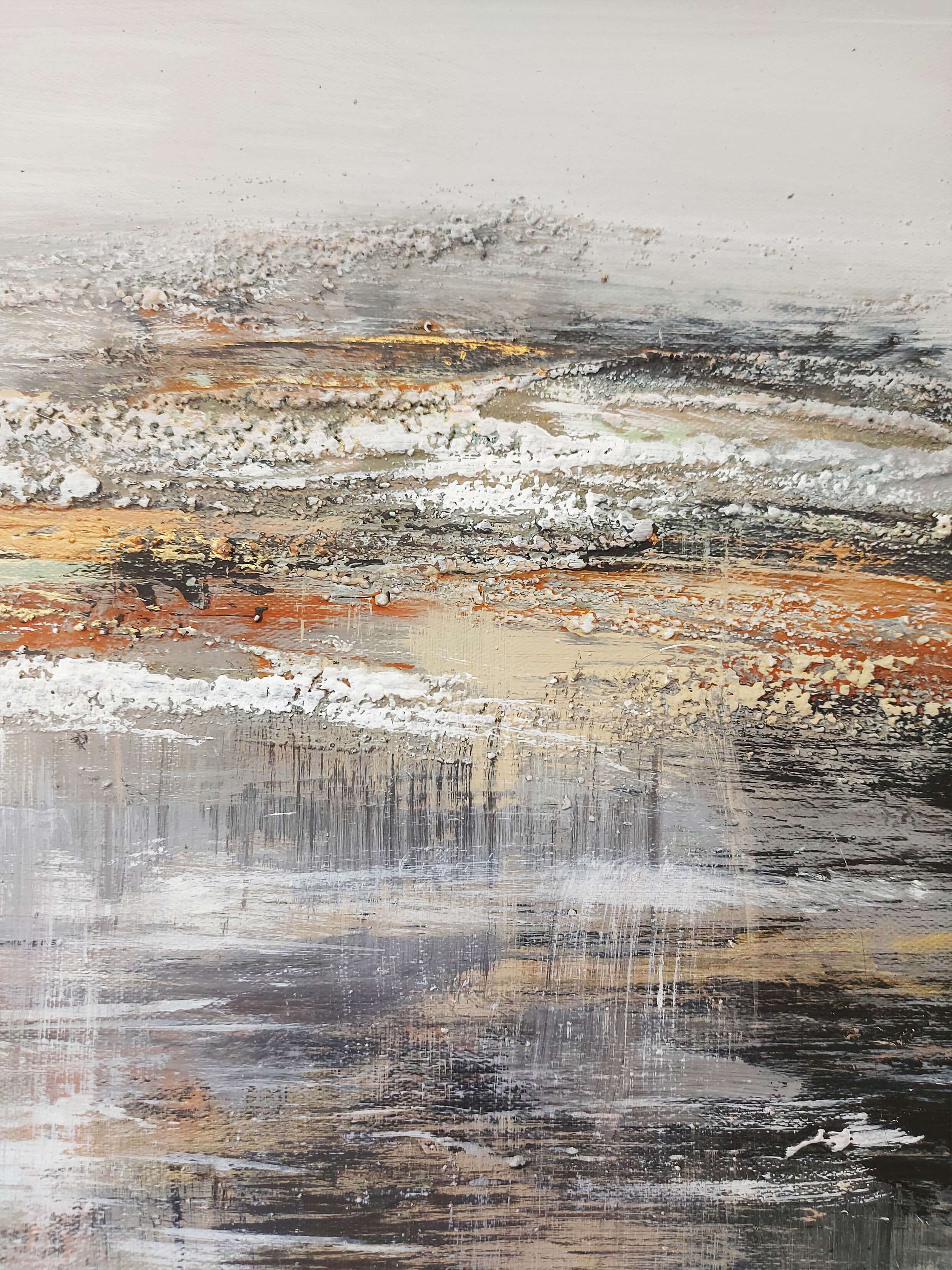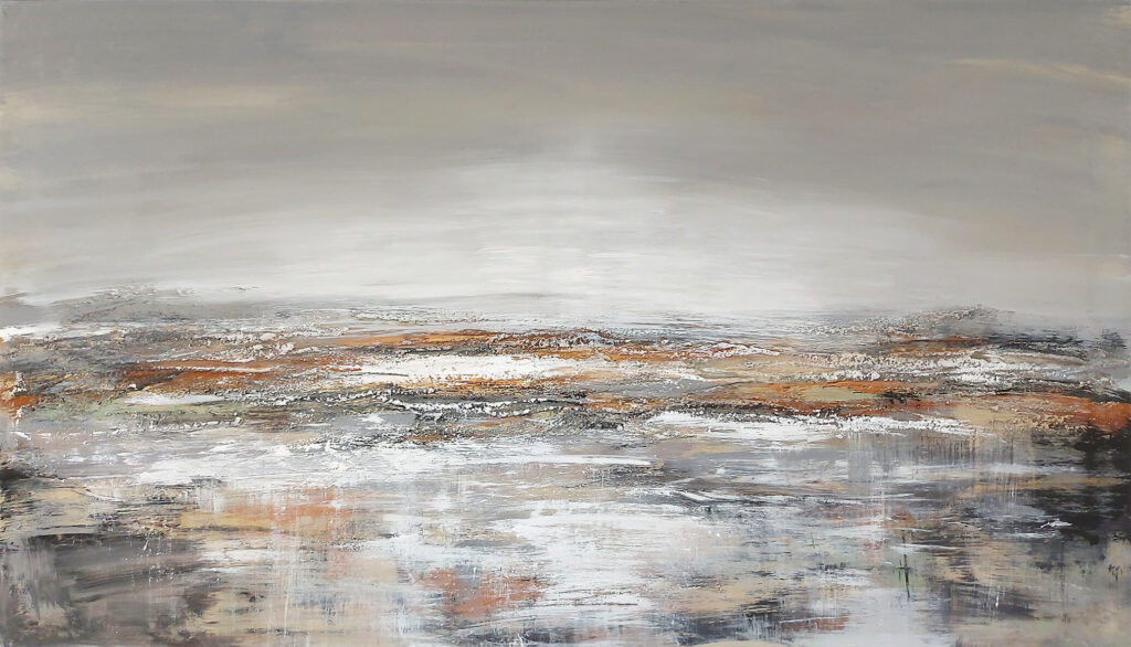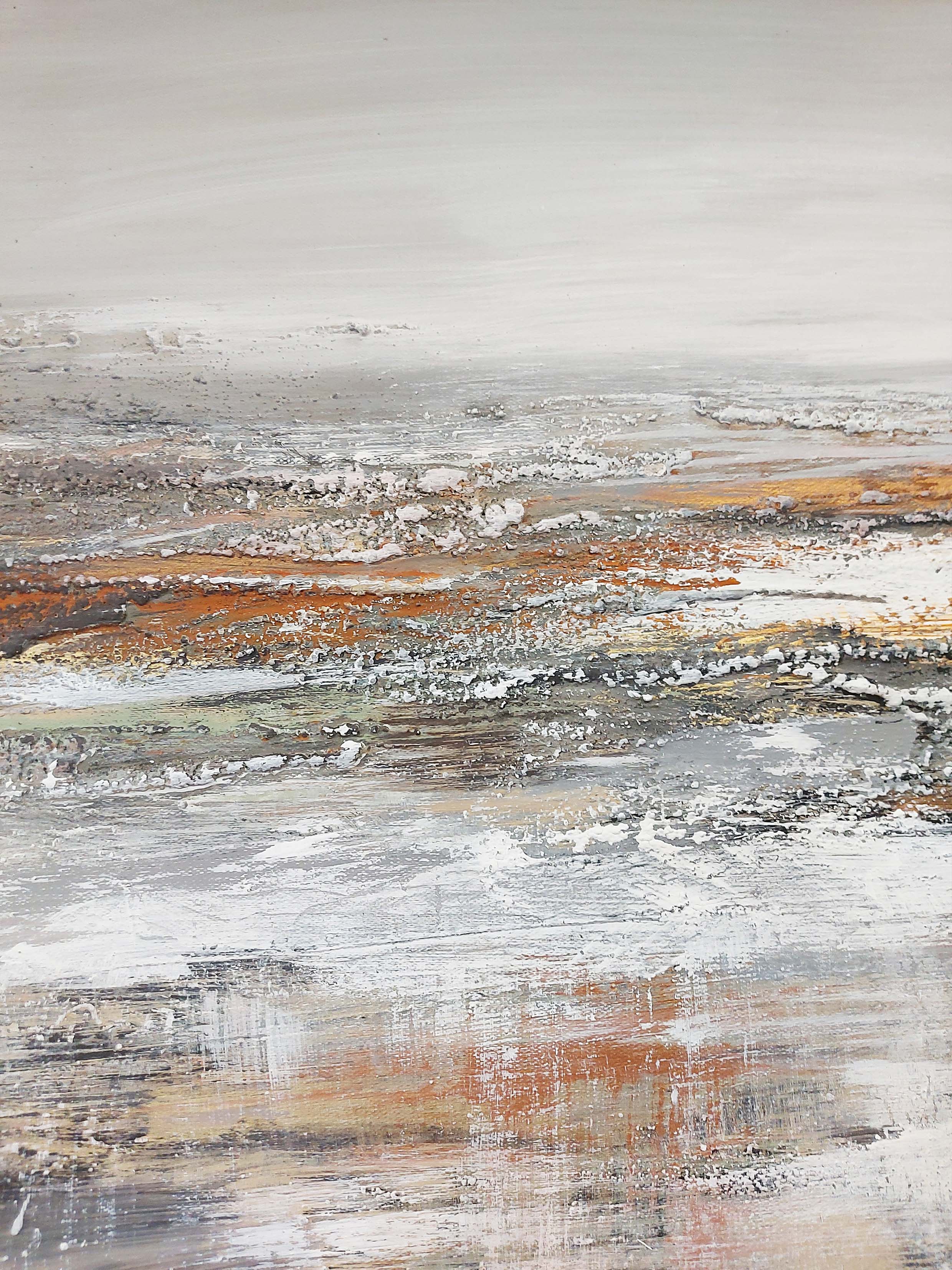 “Terra Rossa” evokes a sense of earthy warmth and subtle harmony. It has a balanced interplay of light gray and rich brown-orange tones, creating a serene, grounded atmosphere. The muted colors blend together, reminiscent of a rugged, natural landscape, yet the abstraction leaves space for personal interpretation. The piece invites contemplation, capturing the essence of the earth’s textures and the quiet beauty of its varied, organic hues.